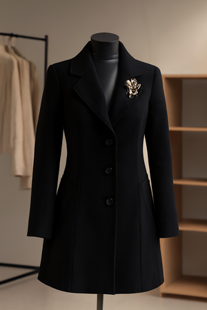 Add a touch of sophistication to your wardrobe with this elegant black women's coat. Featuring a notched lapel, sleek tailoring, and a gold floral brooch, it offers a flattering silhouette with a slightly flared bottom. Perfect for both casual and formal occasions, this coat combines timeless style with a modern twist. Crafted from a high-quality wool blend, it provides comfort and warmth while maintaining a refined, polished look. Ideal for layering over dresses or pairing with jeans for an effortlessly chic ensemble. Elevate your winter fashion with this must-have wardrobe staple.