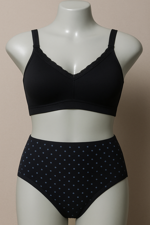 Elevate your undergarment collection with this stylish black bra and panty set. Featuring a comfortable, stretchy fit and a chic lace neckline, this set offers a blend of support and femininity. The high-waisted panties with dot prints provide a flattering fit, making it perfect for both everyday wear and special occasions.